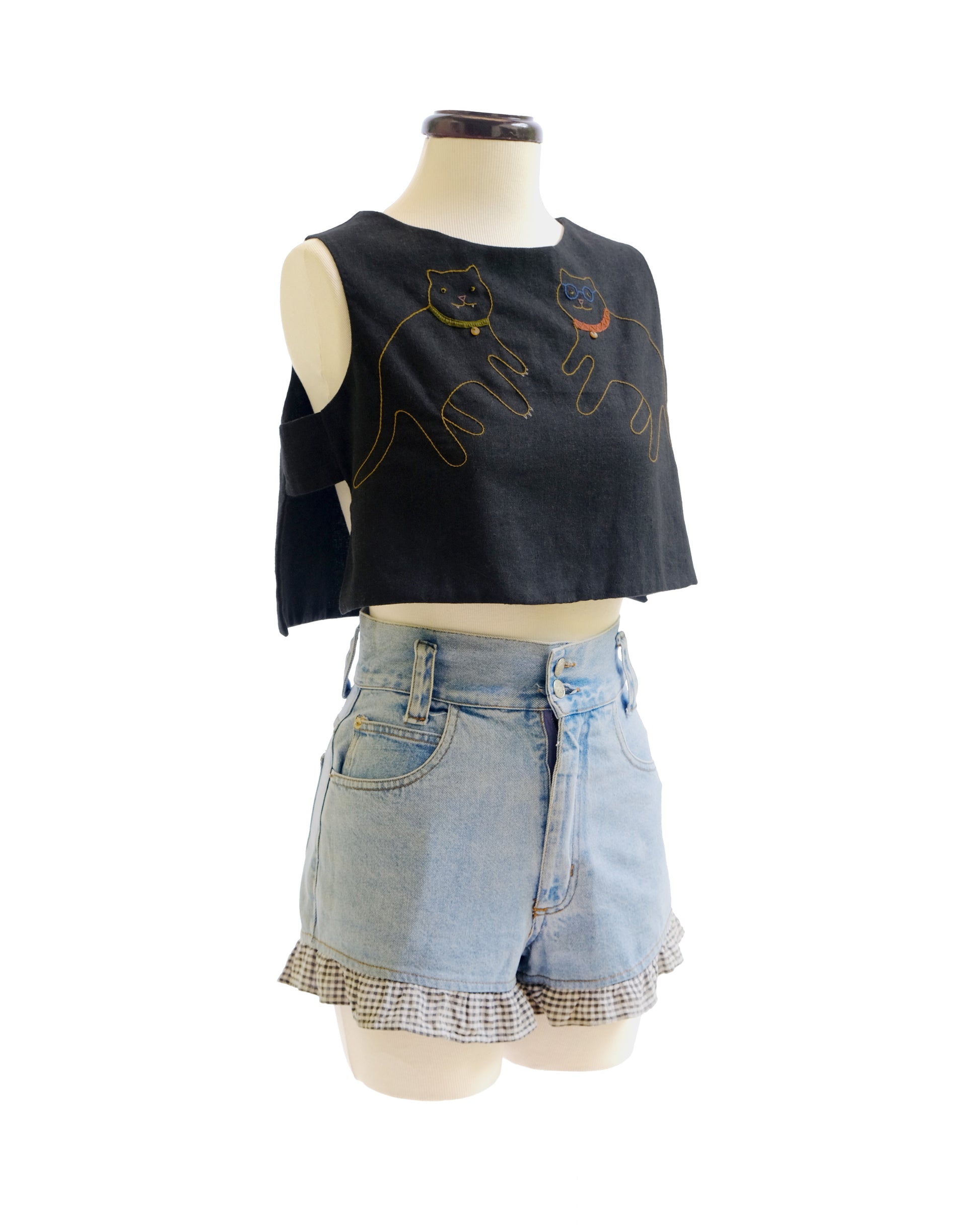 A modern, comfortable, and casual top. We created this top with a simple shape that can be worn with different styles, using natural fabrics that allow the skin to breathe, and with a cut that adapts to different body types. At Margay, we love animals, especially kittens. We love getting to know their unique personalities, and we wanted to represent that in this design, where we hand-embroidered an intellectual kitten and a mischievous kitten.
